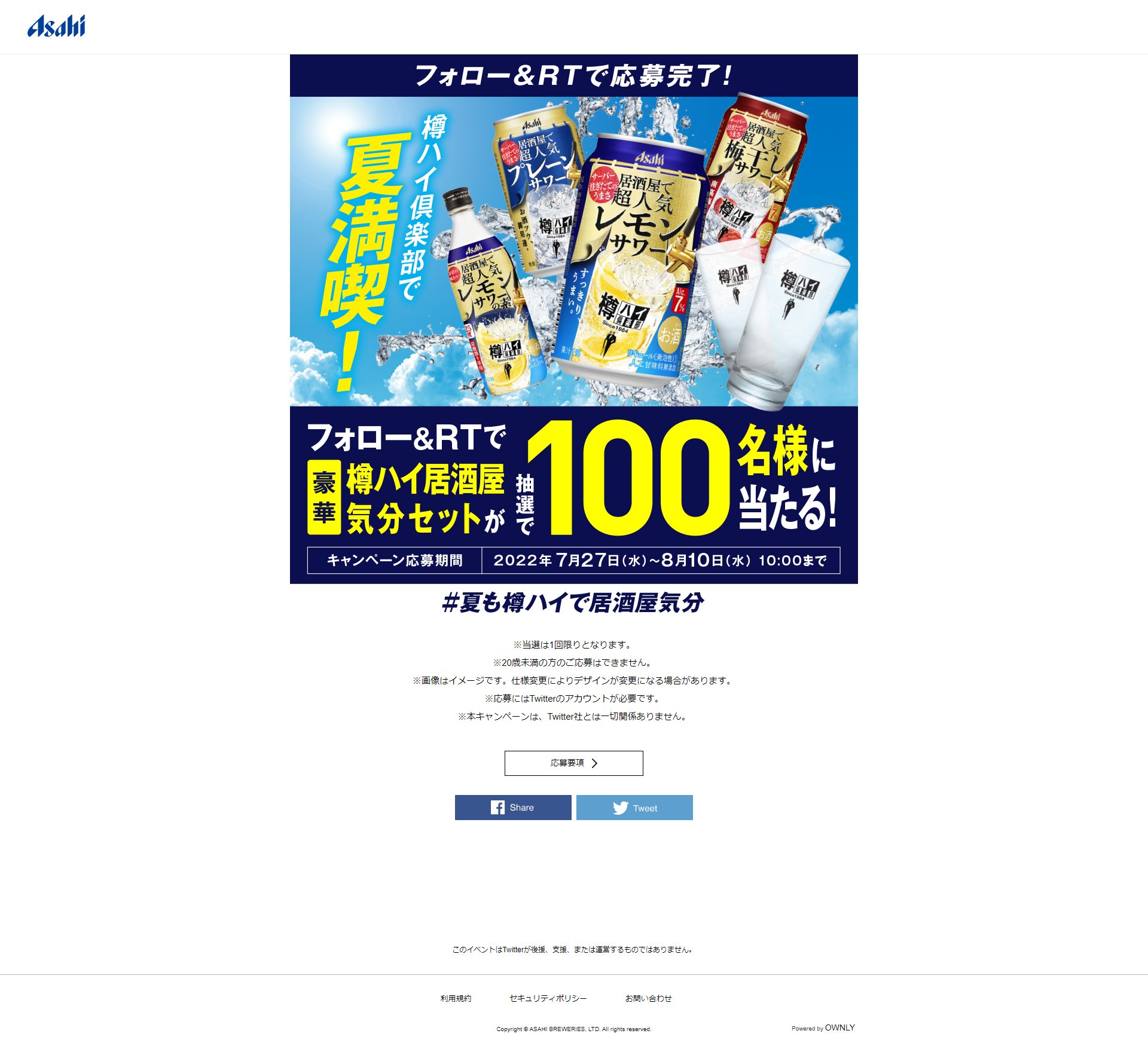 2.「#夏も樽ハイで居酒屋気分」のハッシュタグがついたアサヒビール公式アカウントのキャンペーン対象のツイートをキャンペーン期間内にリツイートしてください。