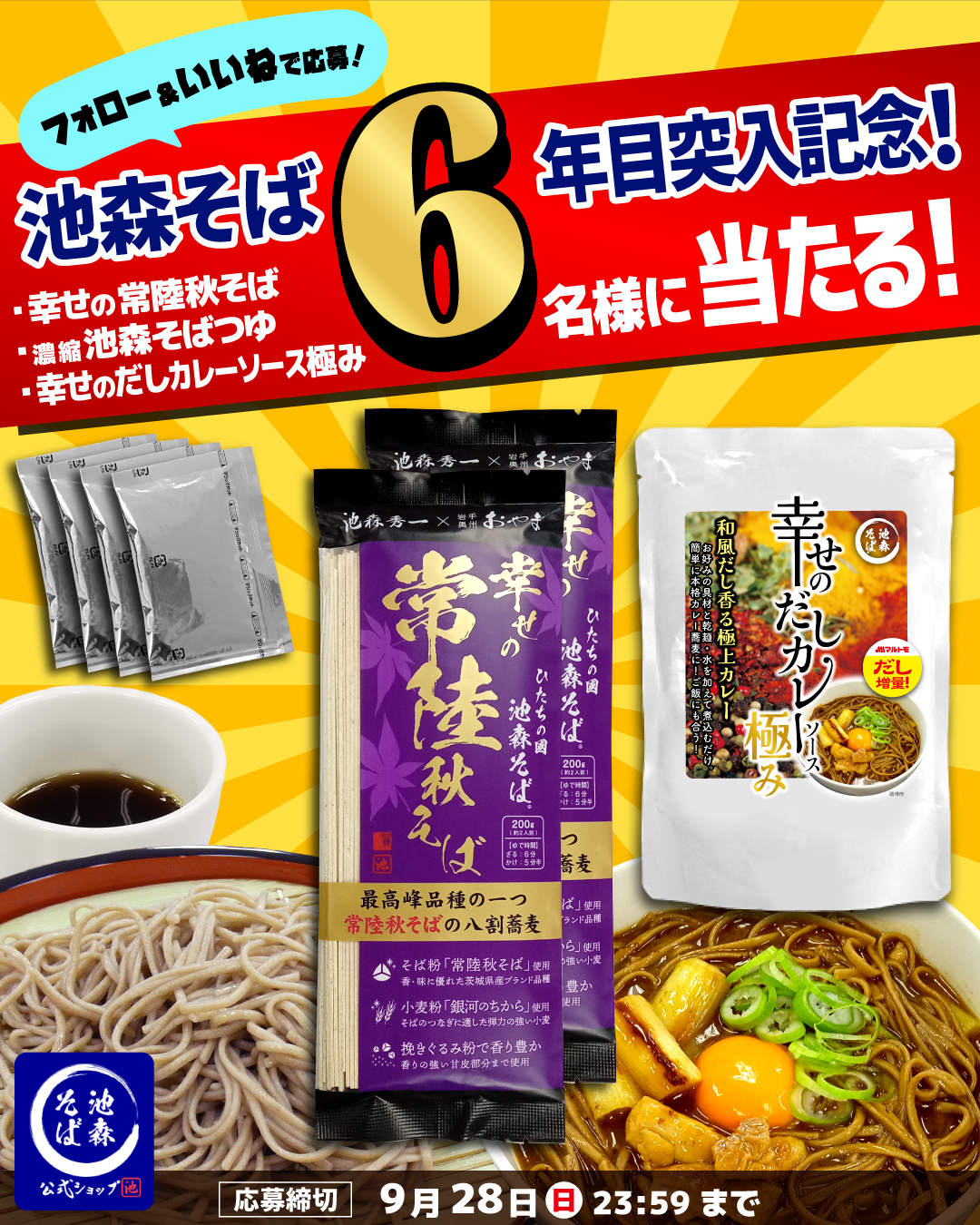 - ・幸せの常陸秋そば2袋 ・幸せのだしカレーソース1袋 ・濃縮池森そばつゆ4袋 6名様