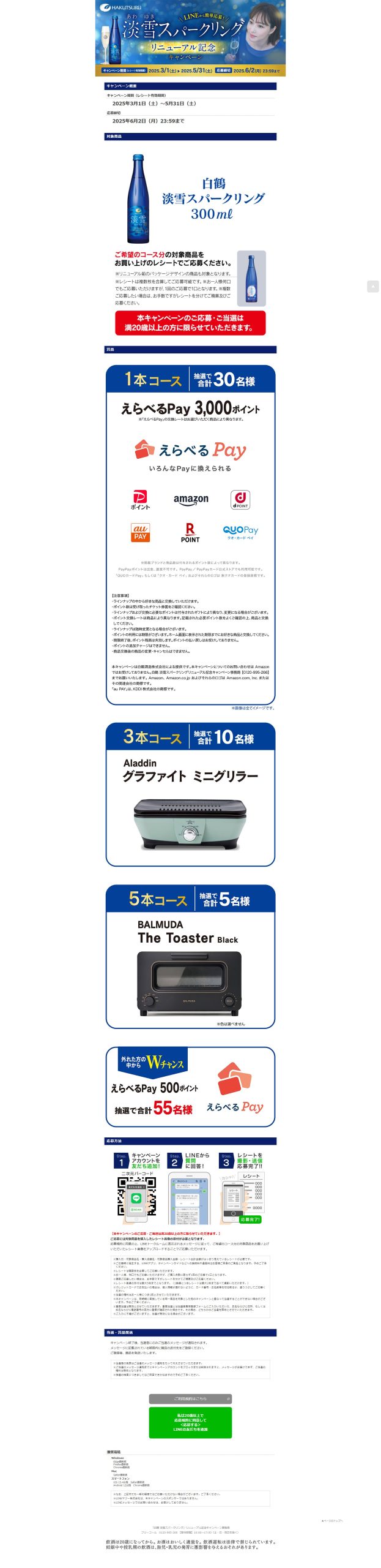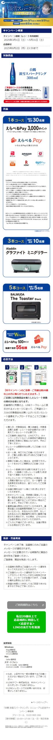- ・1本コース:えらべるPay 3,000ポイント30名様 ・3本コース:Aladdin グラファイト ミニグリラー10名様 ・5本コース:BALMUDA The Toaster Black5名様 ・Wチャンス:えらべるPay 500ポイント55名様