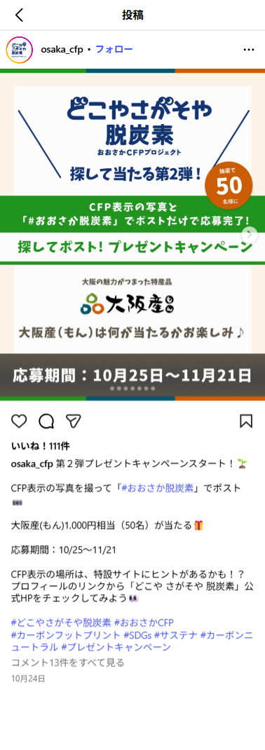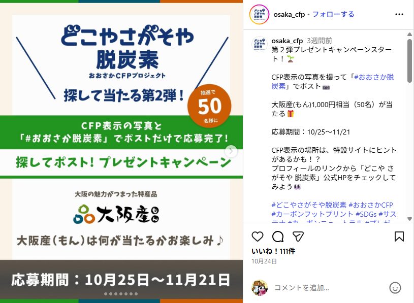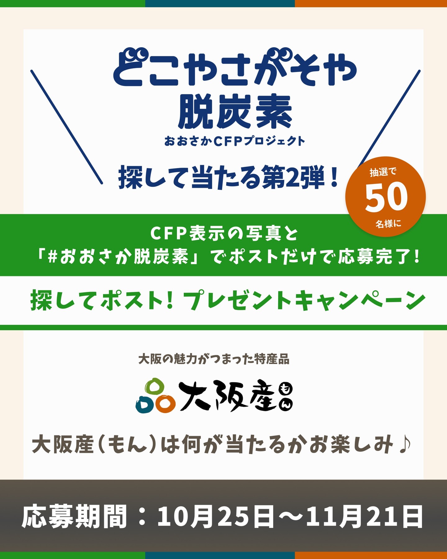 第2弾プレゼントキャンペーンスタート!🌱 CFP表示の写真を撮って「#おおさか脱炭素」でポスト📷️
