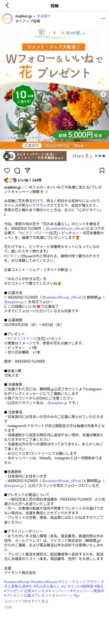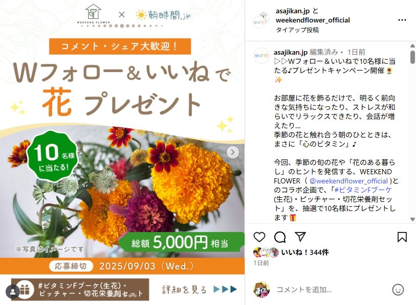 1. WEEKEND FLOWER( @weekendflower_official )と朝時間.jp( @asajikan.jp )を両方フォロー