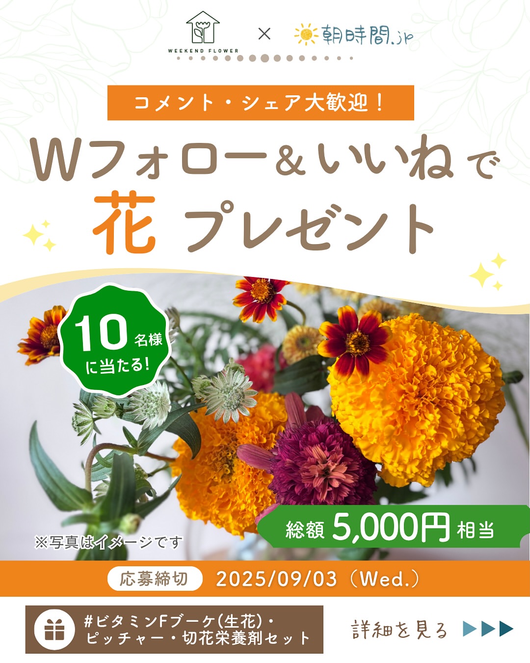 - 総額5,000円相当!「花束・ピッチャー・切花栄養剤セット」が当たる♪Instagramフォロー&いいねキャンペーン