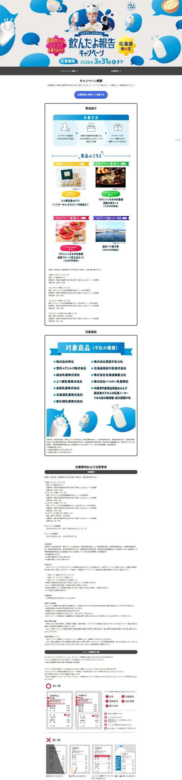 応募条件:対象の北海道牛乳を含む400円(税込)以上のレシート1枚応募