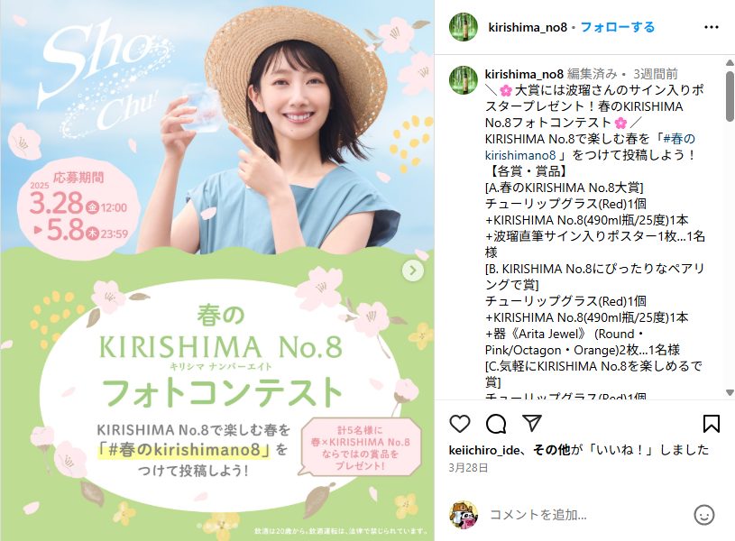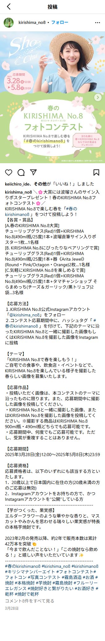 2.コンテスト応募期間中に、ハッシュタグ「 #春のkirishimano8 」を付けて、下記のテーマに沿ったKIRISHIMA No.8と一緒に撮影した画像もしくはKIRISHIMA No.8を撮影した画像をInstagramに投稿