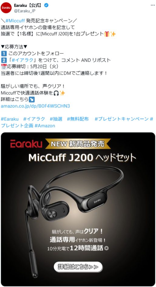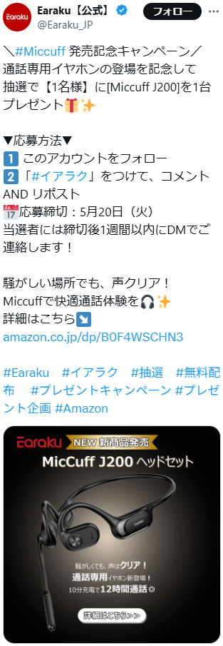 - \#Miccuff 発売記念キャンペーン/ 通話専用イヤホンの登場を記念して 抽選で【1名様】に[Miccuff J200]を1台プレゼント🎁✨