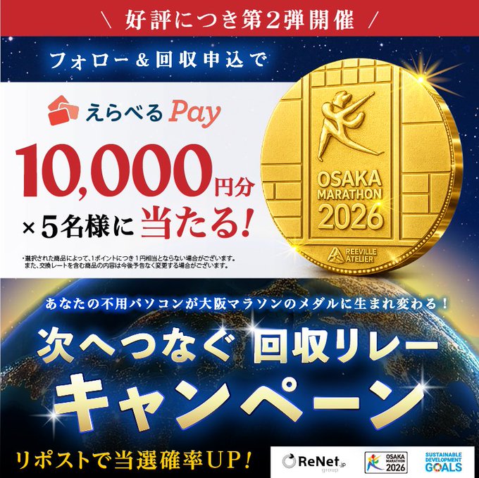- 📣次へつなぐ 回収リレーキャンペーン! あなたの使わなくなったパソコンが 大阪マラソン2026のメダルに生まれ変わる🏅