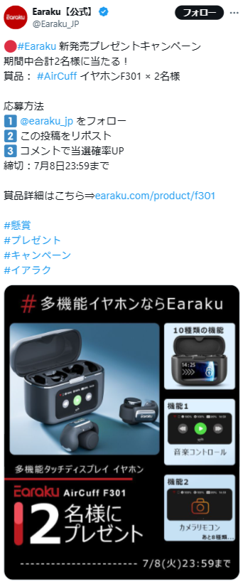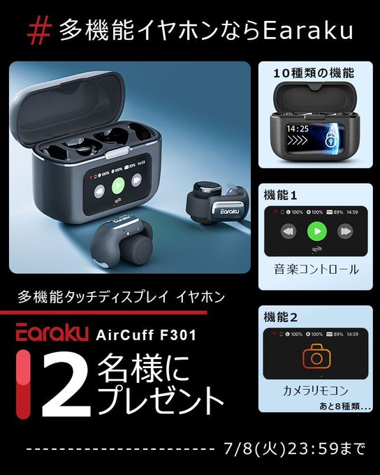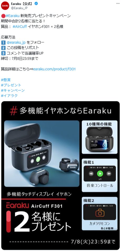 - 🔴#Earaku 新発売プレゼントキャンペーン 期間中合計2名様に当たる! 賞品: #AirCuff イヤホンF301 × 2名様