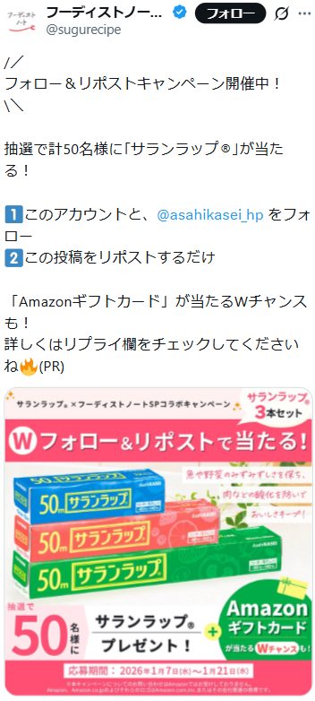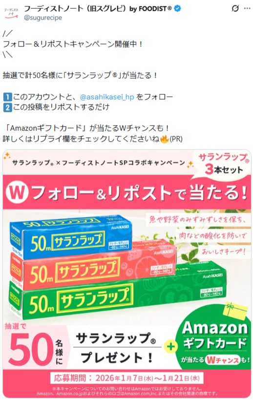 - 2つのアカウントをフォロー&リポストで「サランラップ®」「Amazonギフトカード」を当てよう!合計50名さまに当たります♪