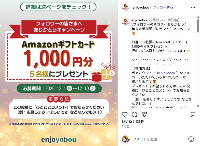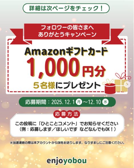 当アカウント(@enjoyobou )をフォローいただいているすべてのユーザー様が対象です🎁