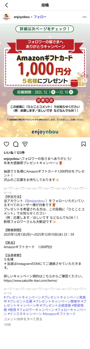 - Amazonギフトカード1,000円分が当たる!Instagramキャンペーン