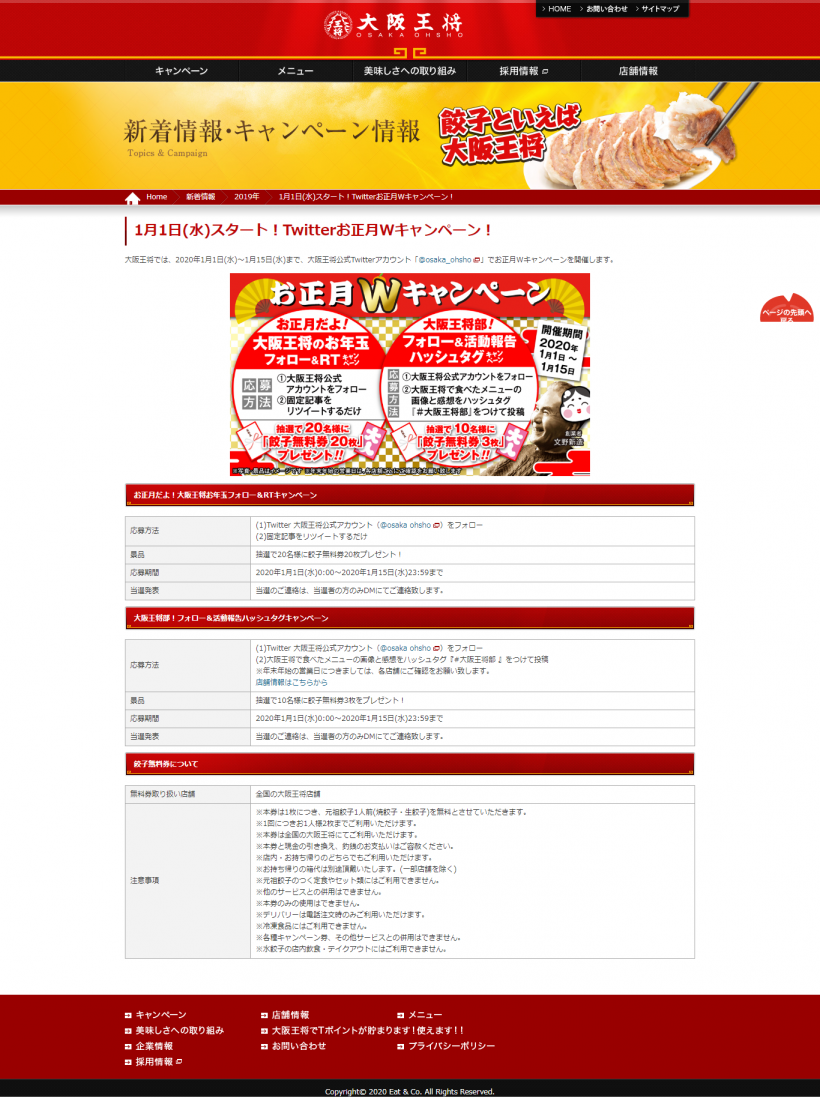【イートアンド株式会社】 お正月だよ!大阪王将お年玉フォロー&RTキャンペーン