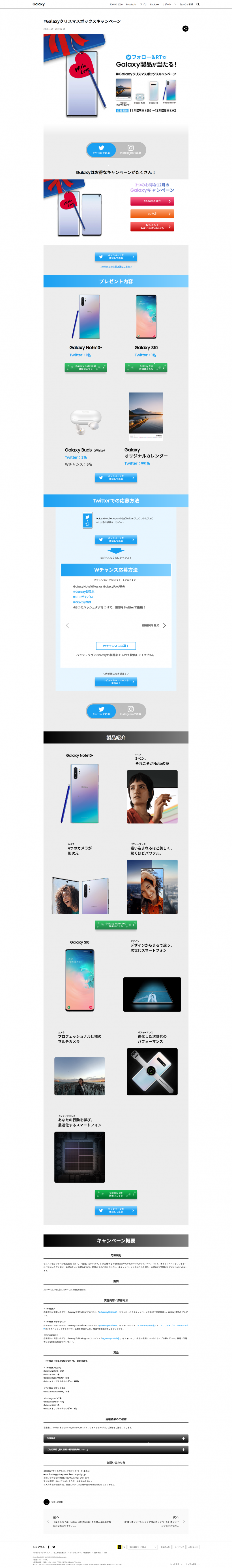 - Galaxy Note10+ Twitter:1名 Instagram:1名 Galaxy S10 Twitter:1名Instagram:1名 Galaxy Buds(White)Twitter:3名 Wチャンス:5名 Galaxyオリジナルカレンダー Twitter:991名 Instagram:5名