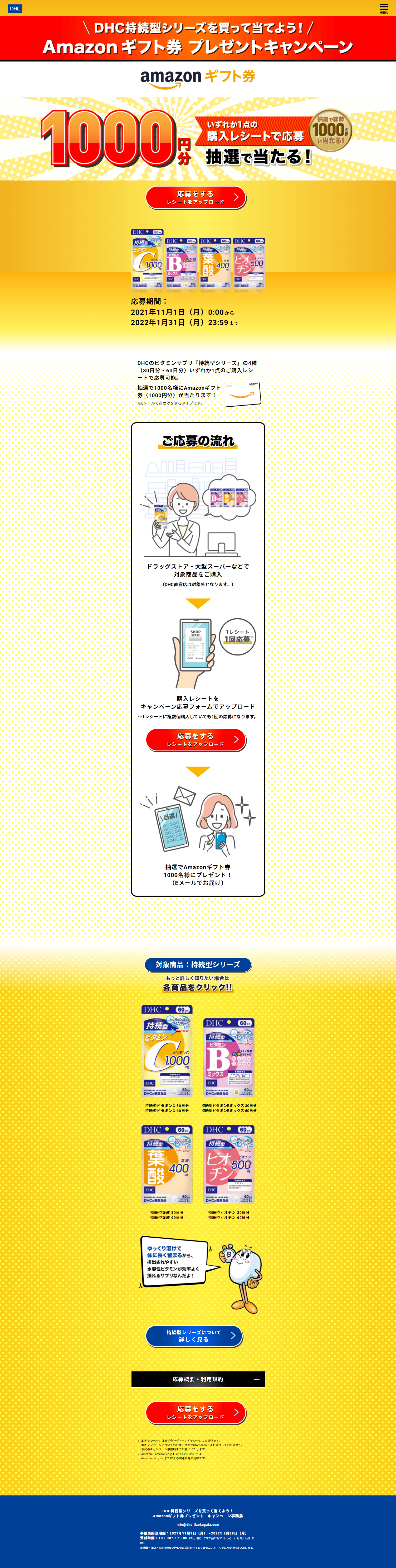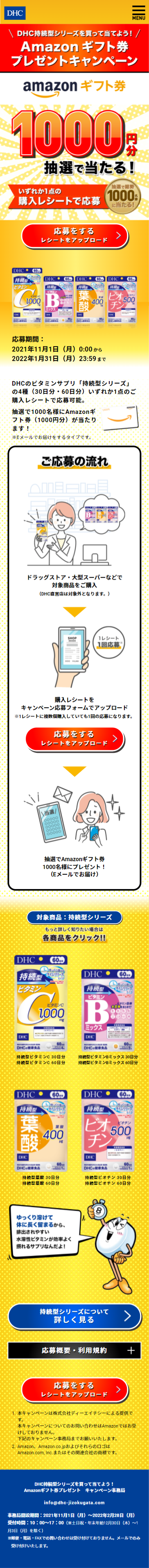 - DHCのビタミンサプリ「持続型シリーズ」の4種(30日分・60日分)いずれか1点のご購入レシートで応募可能。