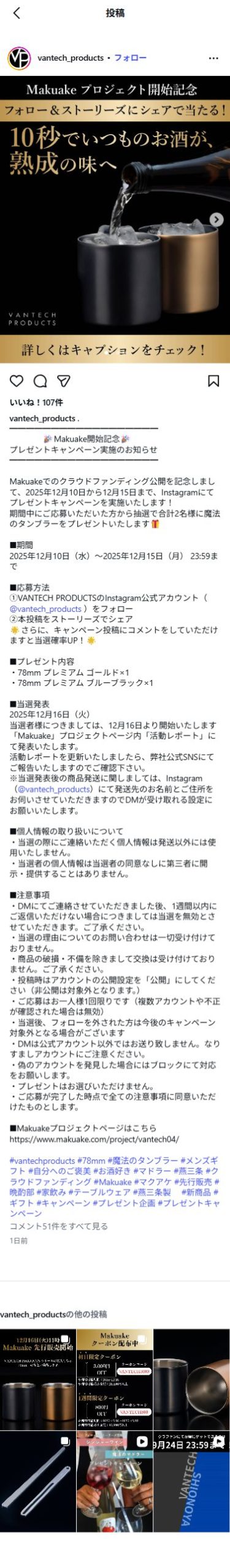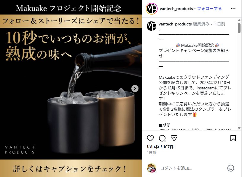 Makuakeプロジェクト開始記念 フォロー&ストーリーズにシェアで魔法のタンブラー78mmが当たる!