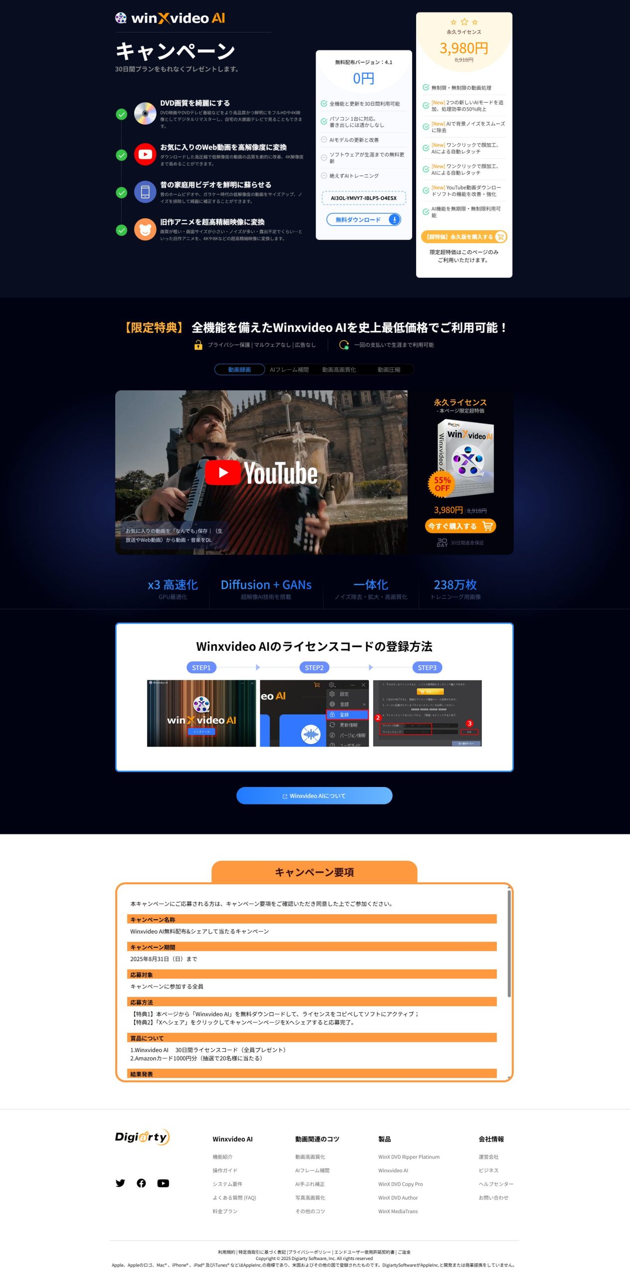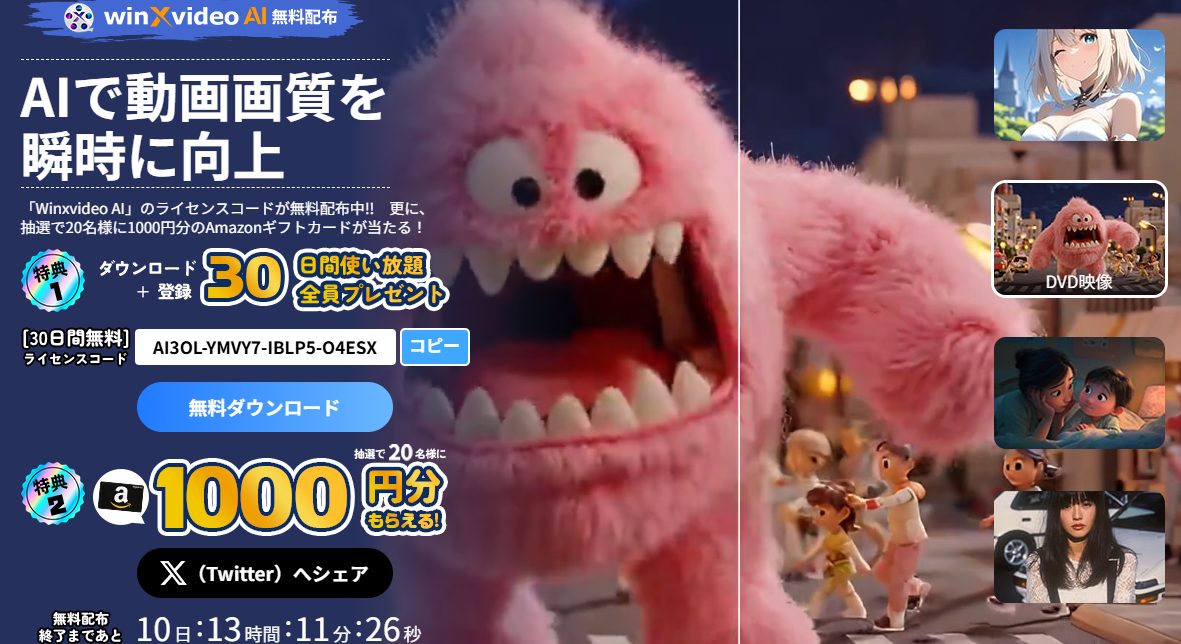 【特典1】本ページから「Winxvideo AI」を無料ダウンロードして、ライセンスをコピペしてソフトにアクティブ;